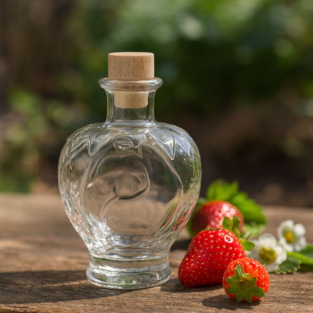 The motif bottle "Strawberry" impresses with its charming, detailed design and brings the sweetness and freshness of the popular summer fruit into an elegant glass form. Made from high-quality clear glass, it is perfect for fine spirits, fruity brandies, or exquisite liqueurs. The harmoniously textured surface resembles the natural texture of a strawberry, making the bottle a real eye-catcher. Thanks to the cork neck, the contents can be securely and stylishly sealed.