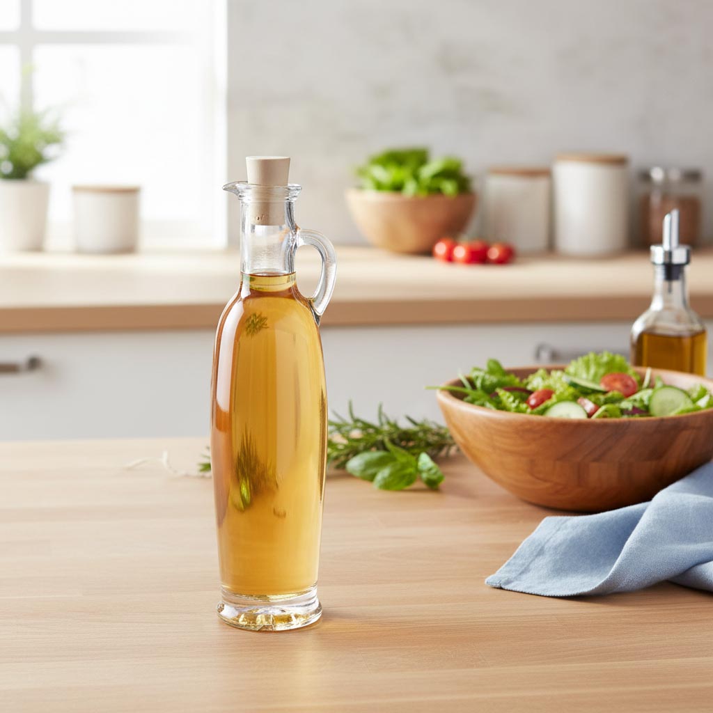 The "Beak Mouth Bottle" product series from Flaschenland includes high-quality glass containers specifically designed for storing and dispensing liquids such as vinegar and oil. With their distinctive beak mouth opening and practical cork stopper, these bottles combine functionality with timeless design. The 250 ml glass bottle 'Simona' stands out due to its robust, heat- and cold-resistant glass material, which is also dishwasher safe, microwave and oven proof. These versatile features make the bottle particularly durable and easy to maintain. The round shape of the container ensures comfortable handling and secure storage. The cork stopper provides a reliable seal while allowing easy dosing of liquids.