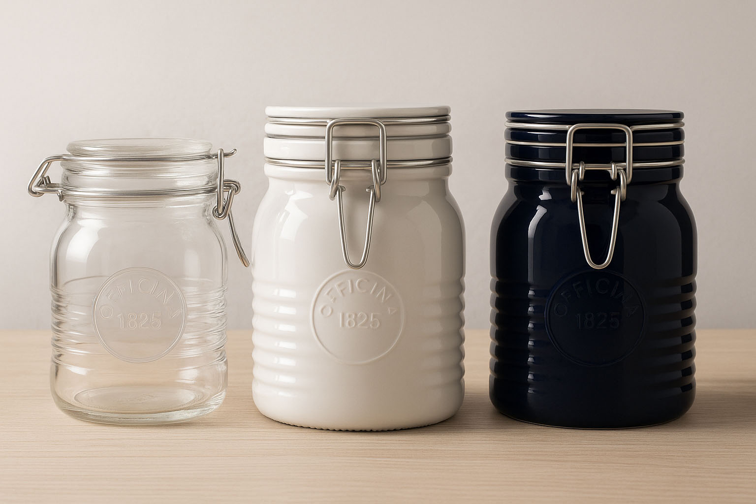 The "Officina 1825" series from the Italian manufacturer Bormioli Rocco combines high-quality craftsmanship with nostalgic charm. The distinctive design, featuring grooves along the glass rim and the embossed "1825" logo, makes each glass a real eye-catcher. These stylish wire bail jars were specially developed for gourmet producers, hotels, and discerning private bottlers who value aesthetics and quality. Available in blue, red, and white as part of the special Colour series, "Officina 1825" offers an exclusive way to store fine specialties tastefully and securely.